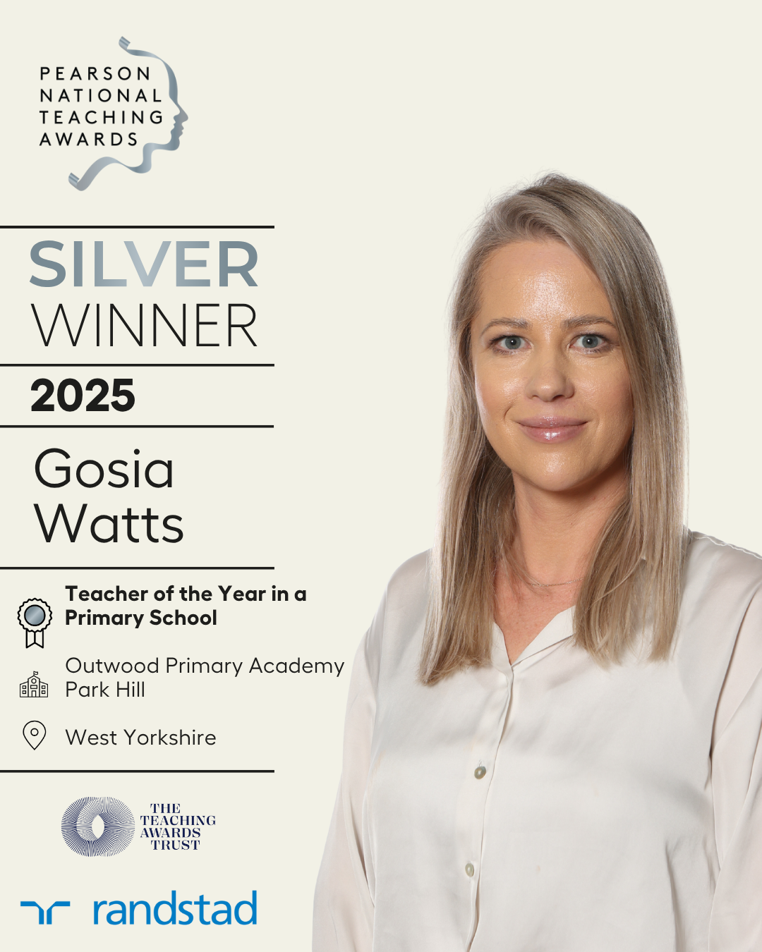 Gosia Watts of Outwood Primary Academy Park Hill, Wakefield, was announced as a Silver Award winner for Teacher of the Year in a Primary School earlier this year and is now in the running for Gold.