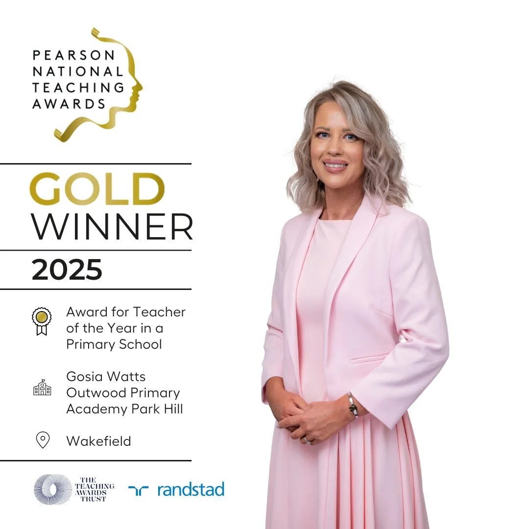 Gosia Watts, teacher at Outwood Primary Academy Park Hill, has been recognised as the Gold Winner of the Award for Teacher of the Year in a Primary School, in the 2025 Pearson National Teaching Awards, considered the ‘Oscars’ of the teaching profession. The exclusive reveal was mentioned last night on BBC’s The One Show, ahead of a glamorous awards ceremony taking place this weekend.